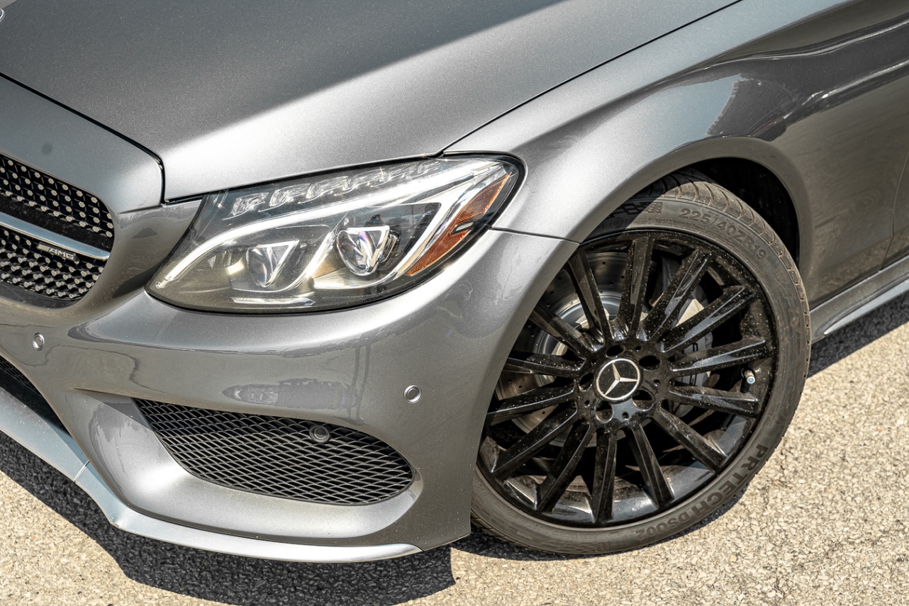 2018 Mercedes-Benz AMG C 43 4MATIC . Powered by a 3.0L twin-turbo V6 (385 hp) paired with a 9-speed automatic transmission and rear-biased all-wheel drive. Features include AMG styling, sport suspension, premium interior, and advanced infotainment.